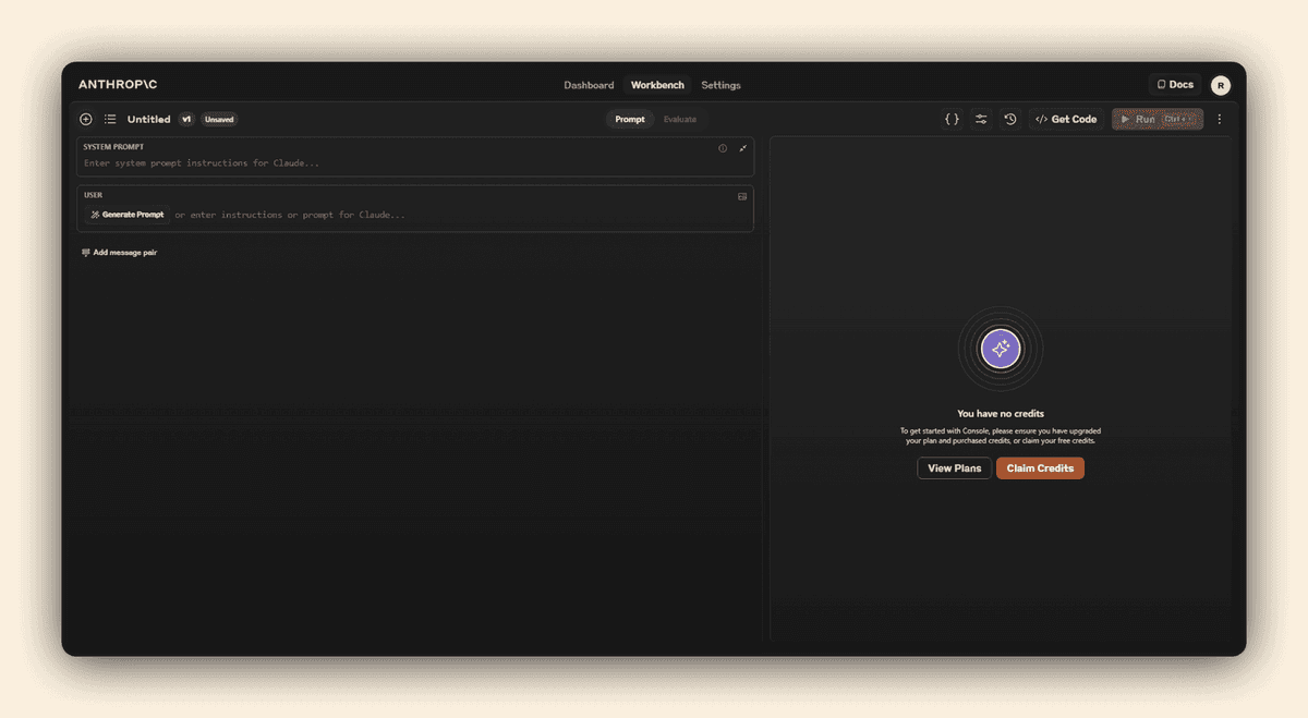 The Workbench is a no-code development environment hosted in the Anthropic dashboard that allows you to interactively chat with Claude, try out different prompts and configurations, and visualize the resulting outputs in real-time. With a WYSIWYG editor, version history, and the ability to share sessions with teammates, the Workbench is a game-changer for prompt engineering and exploratory AI development.
