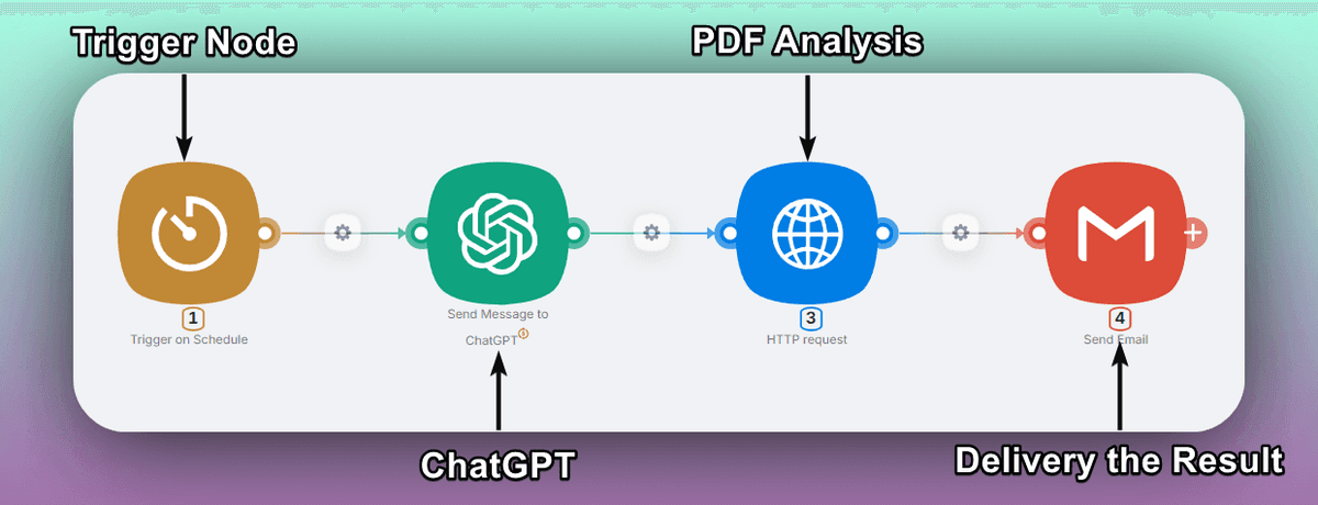 Latenode allows you to automate several tasks when working with PDFs and ChatGPT. Here are a few examples: