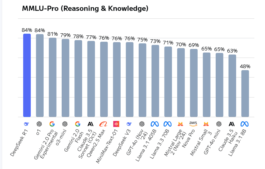 It scores 84% on the MMLU-Pro benchmark for reasoning and knowledge (on par with OpenAI o1 and well ahead of o3-mini) and tackles coding tasks on Codeforces with a 2029 rating – quite close to o1’s 2061.