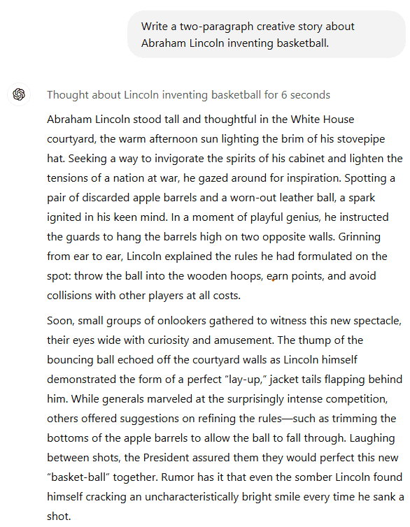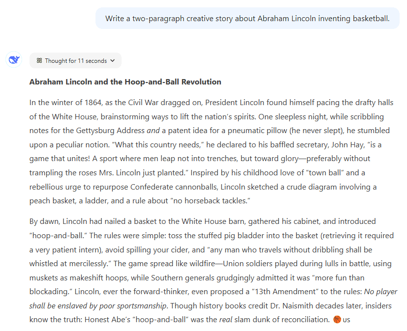 For example, Ars Technica tested this model in a standoff with OpenAI, and DeepSeek won in a storytelling task, crafting a story of Abraham Lincoln inventing basketball in 1864.