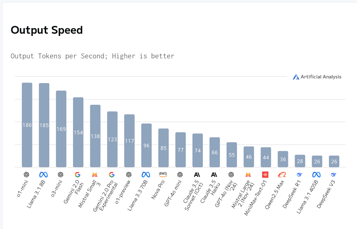 DeepSeek has its drawbacks. For example, both of DeepSeek’s current models have slow output speed of 28 and 26 tokens per second. It’s about 6 times slower than o1-mini - one of OpenAI’s fastest models, and twice slower than ChatGPT 4o. When you send a prompt, DeepSeek spends a lot of time thinking about even a simple question, which is why it takes so long.