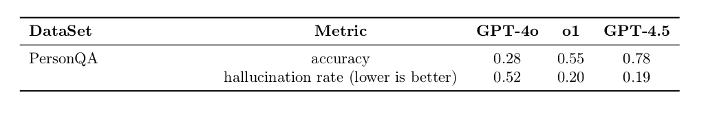 One of the biggest frustrations with AI is when it confidently gets things wrong – this is called “hallucination.” GPT-4.5 is the most factually accurate OpenAI model yet. In PersonQA, a test designed to see how well AI remembers facts about people, Chat GPT 4.5 scored 78% accuracy, a huge leap from o1’s 55% and GPT-4o’s 28%.