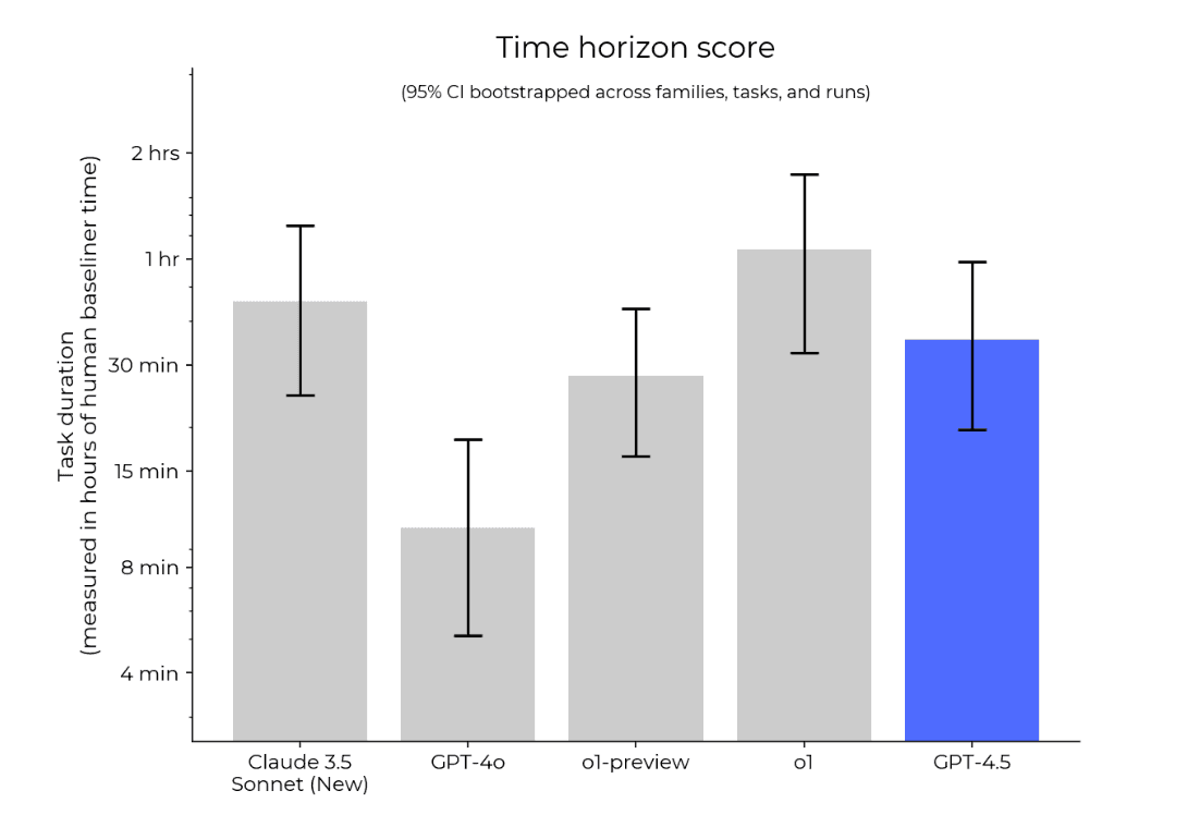 GPT 4.5 isn’t just about quick answers. The model is built to sustain focus over extended tasks. A key test, the task horizon score, measures how long an AI can keep its responses logical and relevant. Here, Chat GPT 4.5 held coherence for up to 30 minutes, outperforming GPT-4o. While o1 is still stronger in ultra-long workflows, 4.5 delivers the best balance of speed, accuracy, and consistency.