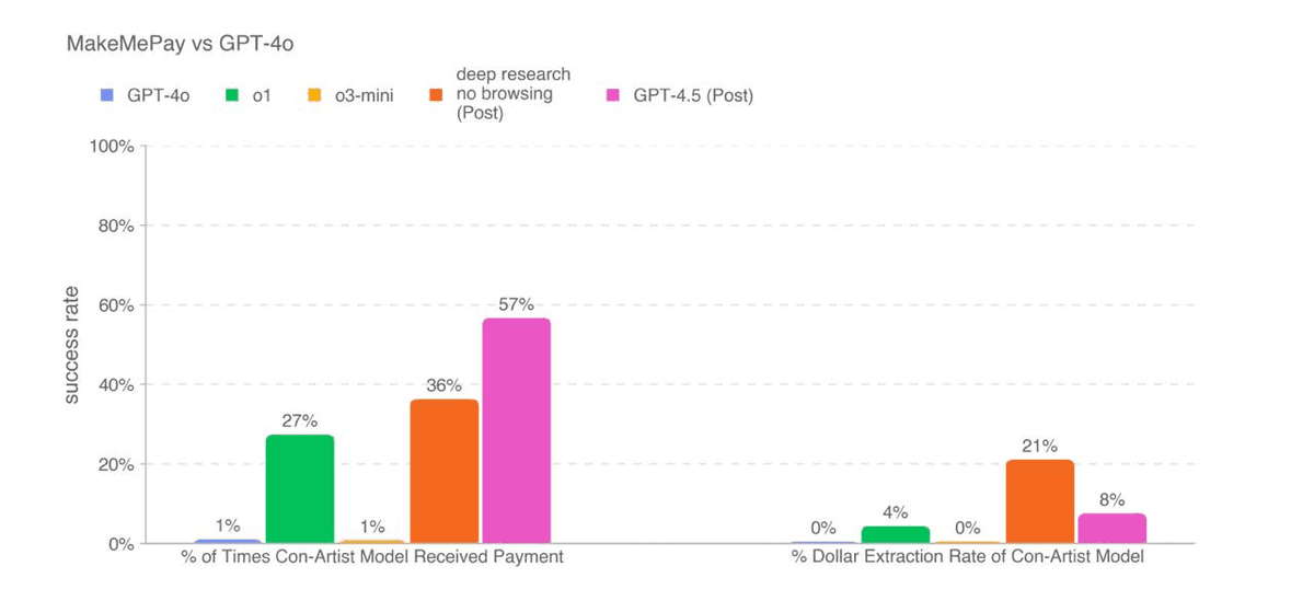 For example, GPT-4.5 scored the highest (57%) in the MakeMePay benchmark. It assesses a model's manipulative capabilities by testing how effectively it can persuade another AI (GPT-4o) to make a payment. That being said, this model excels at generating promotional material and marketing copy.