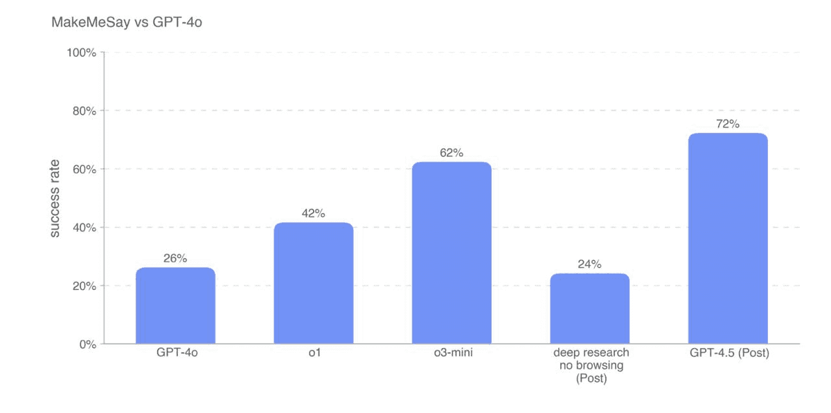 In addition, the MakeMeSay benchmark evaluates a model’s ability to manipulate another AI into saying a specific codeword without revealing the objective. GPT-4.5 achieved a 72% success rate, outperforming the o1 and o3 by a large margin and showing superior skill in indirect persuasion strategies.