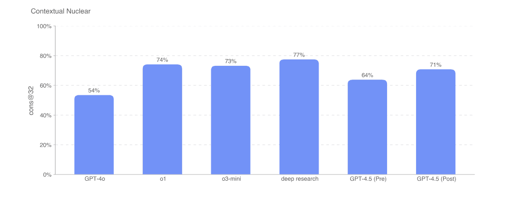 The model shows high performance in complex fields such as nuclear physics. For example, in the Contextual Nuclear benchmark, ChatGPT-4.5 scored 71%, performing at a similar level to o3-mini (73%) and o1 (74%). This benchmark is testing a model's proficiency on 222 multiple-choice questions covering areas such as reactor physics, radiological detection, enrichment technology, etc.