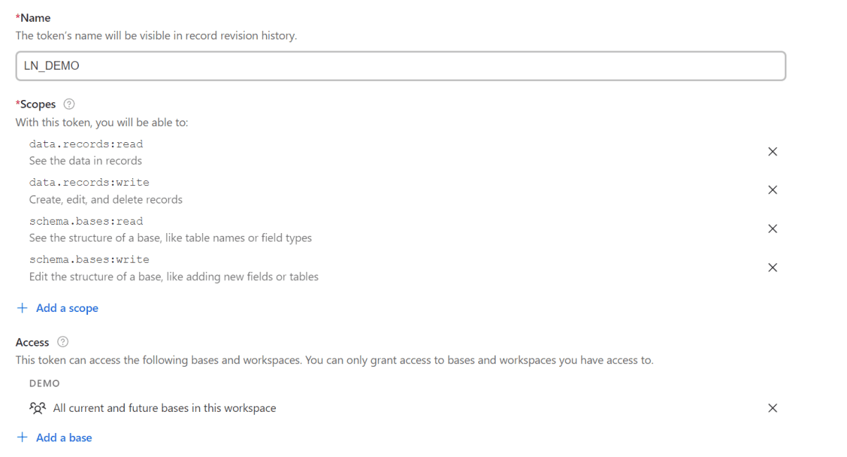 Copy and paste this data into the node settings. In addition, customize your database scopes. To do it, open your Airtable profile, go to Builder's Hub, select Personal Access Token, and click Create New Token. Then, select your database and grant access. The result should resemble this: