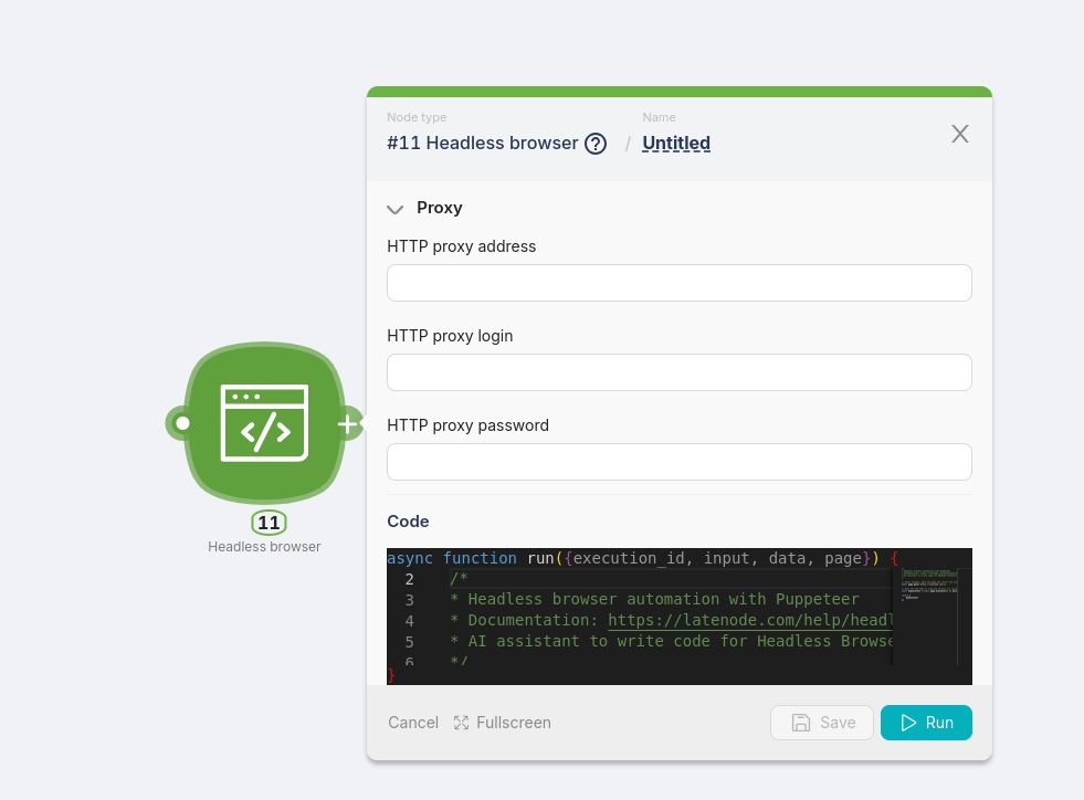 To find this integration, simply navigate to the Code Integrations folder in the node library, where you'll find the Headless Browser node. Add it to your script, click on it, and an editor will open where you can add code of any complexity and length. Additionally, you can specify the address, login, and password of your Proxy in the settings.
