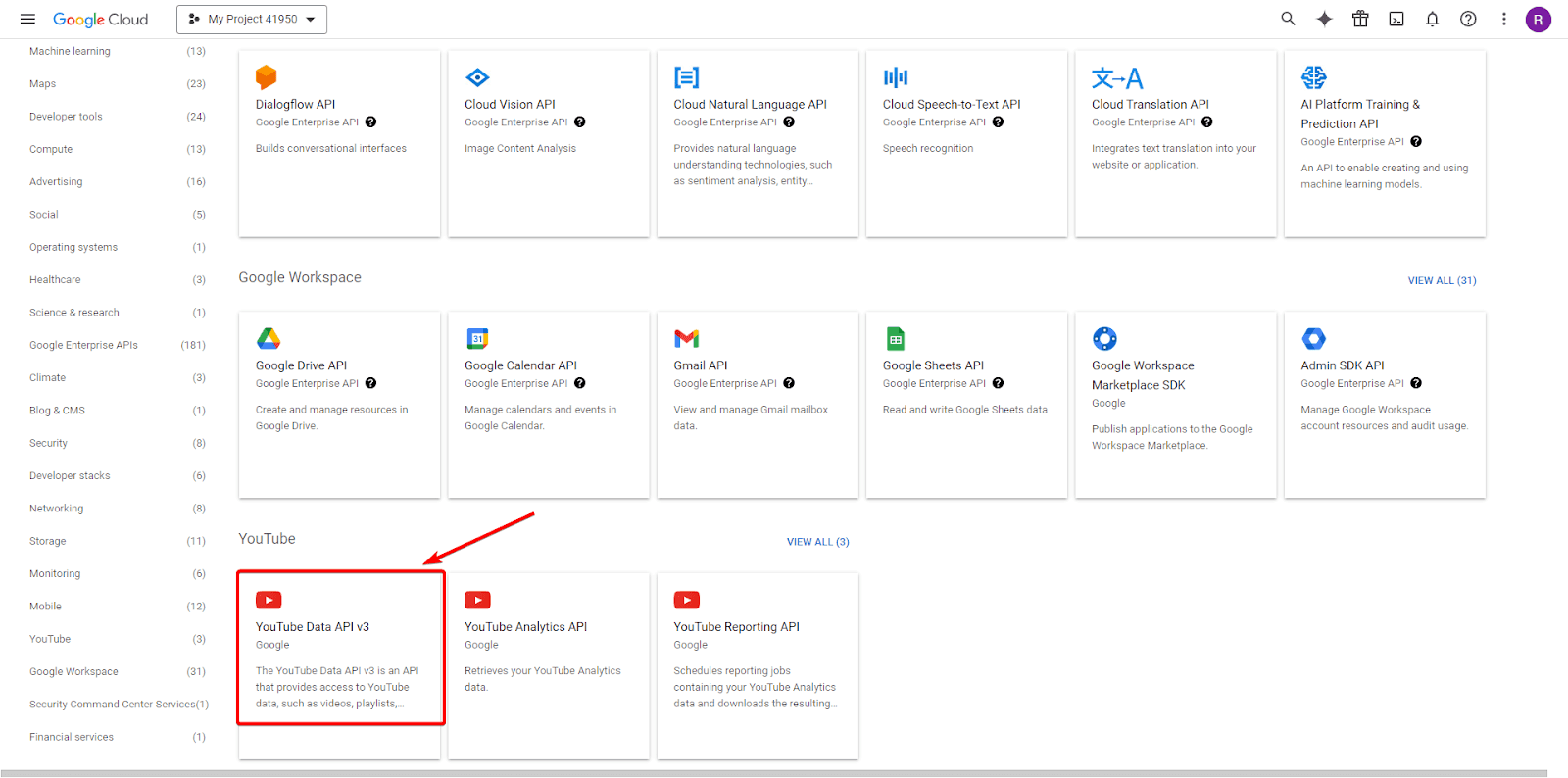 In the search bar, type "YouTube Data API" and select it from the results.