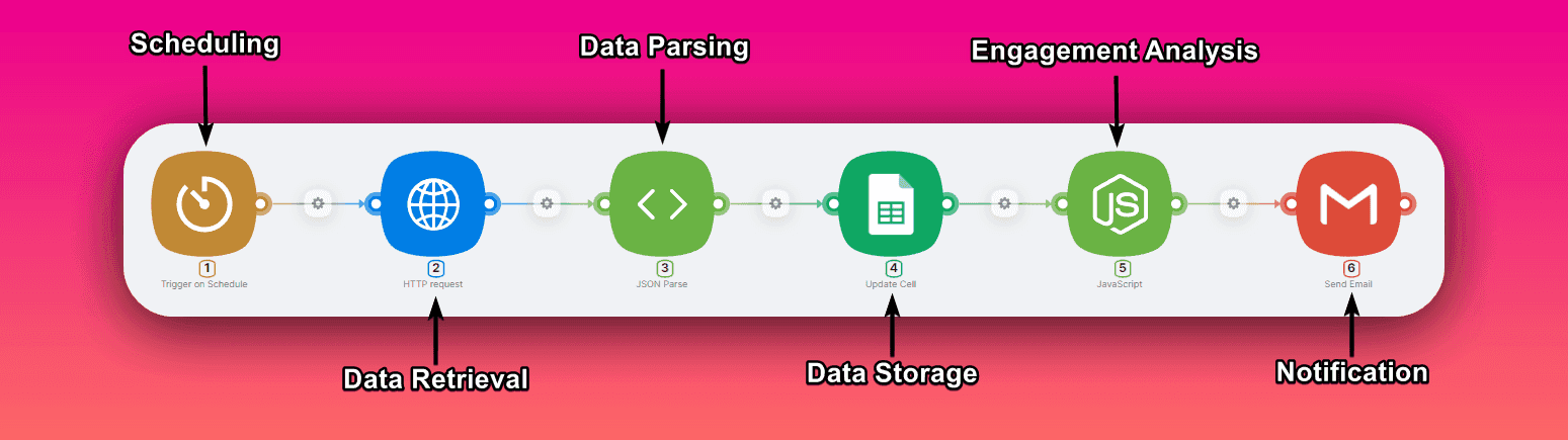 - Data Parsing: Upon successfully receiving a response, Latenode parses the JSON data received from the API, extracting necessary information such as video titles, descriptions, view counts, likes, and comments.
