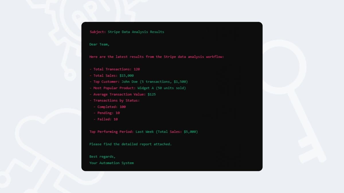 For example, you could create a workflow that automatically collects transaction details from your Stripe account, analyzes sales metrics, and stores the results in a database. This approach not only enhances data collection efficiency but also saves your team time, allowing them to focus on analyzing the results rather than manually gathering data.