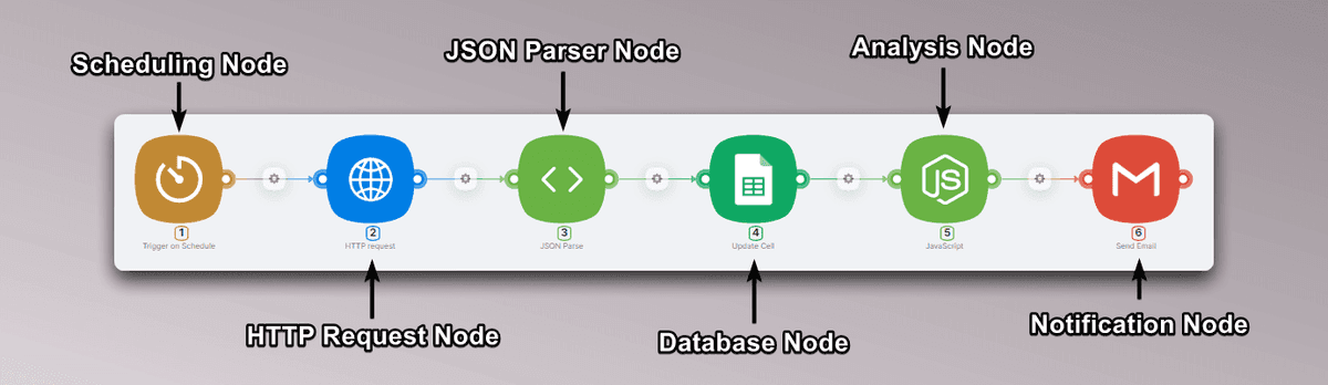 This image would show a visual representation of the workflow in Latenode's interface, with connected nodes representing each step of the process from data collection to analysis and storage.