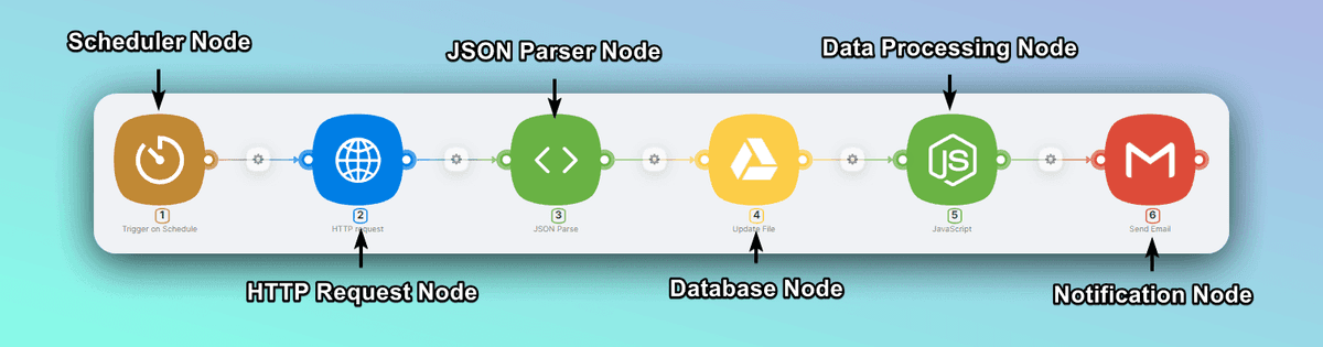 This image would show a visual representation of the workflow in Latenode's interface, with connected nodes representing each step of the process from data collection to analysis and storage.