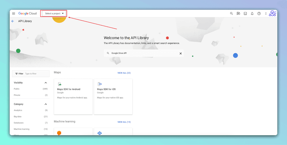 • In the search bar, type "Google Drive API" and select it from the results