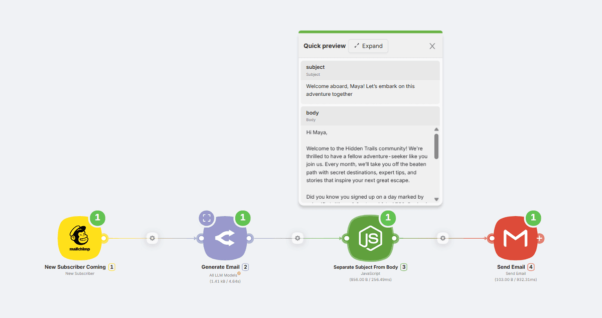Automate custom welcome emails for each new subscriber with ChatGPT and Latenode, integrated with MailChimp and Gmail for seamless delivery.