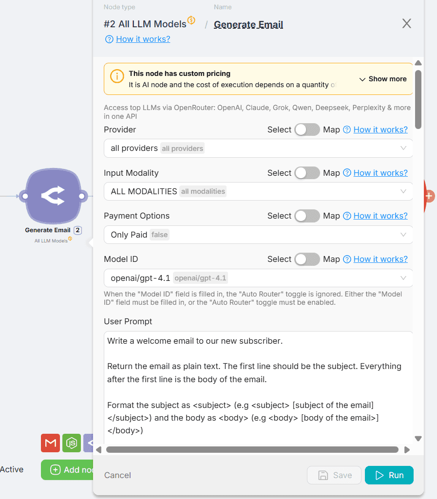 - Press on the ‘Generate Email’ Node to see the settings (e.g ChatGPT model selection, prompt, etc.).