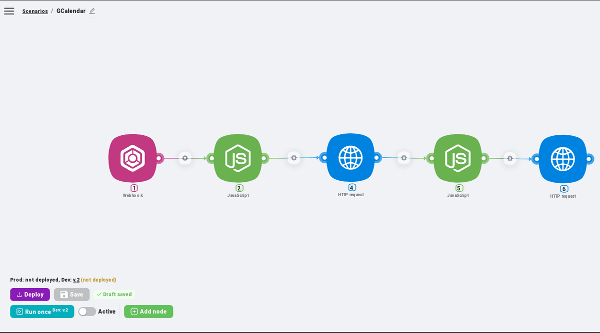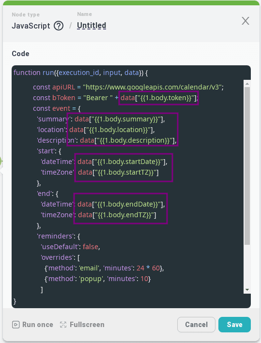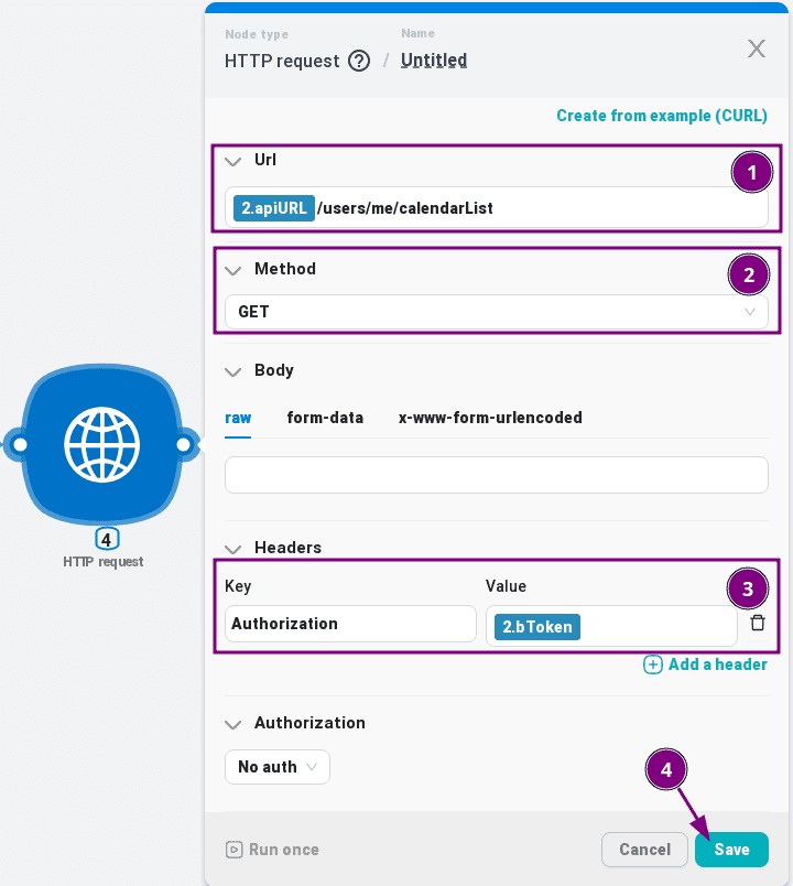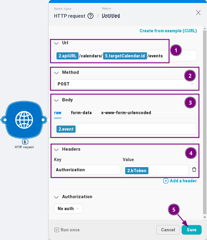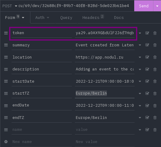 In the "Url" field at the beginning we substitute the variable "apiURL" from the first "JavaScrtipt" node, after it we add: /calendars/, then we substitute the variable "targetCalendar.id" from "JavaScrtipt" with the calendar list processing, and at the end: /events;