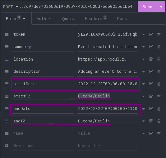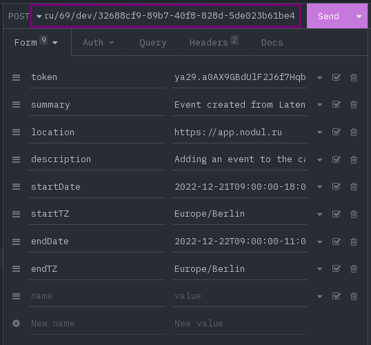 --data 'description=Adding an event to the calendar from Latenode using the API'