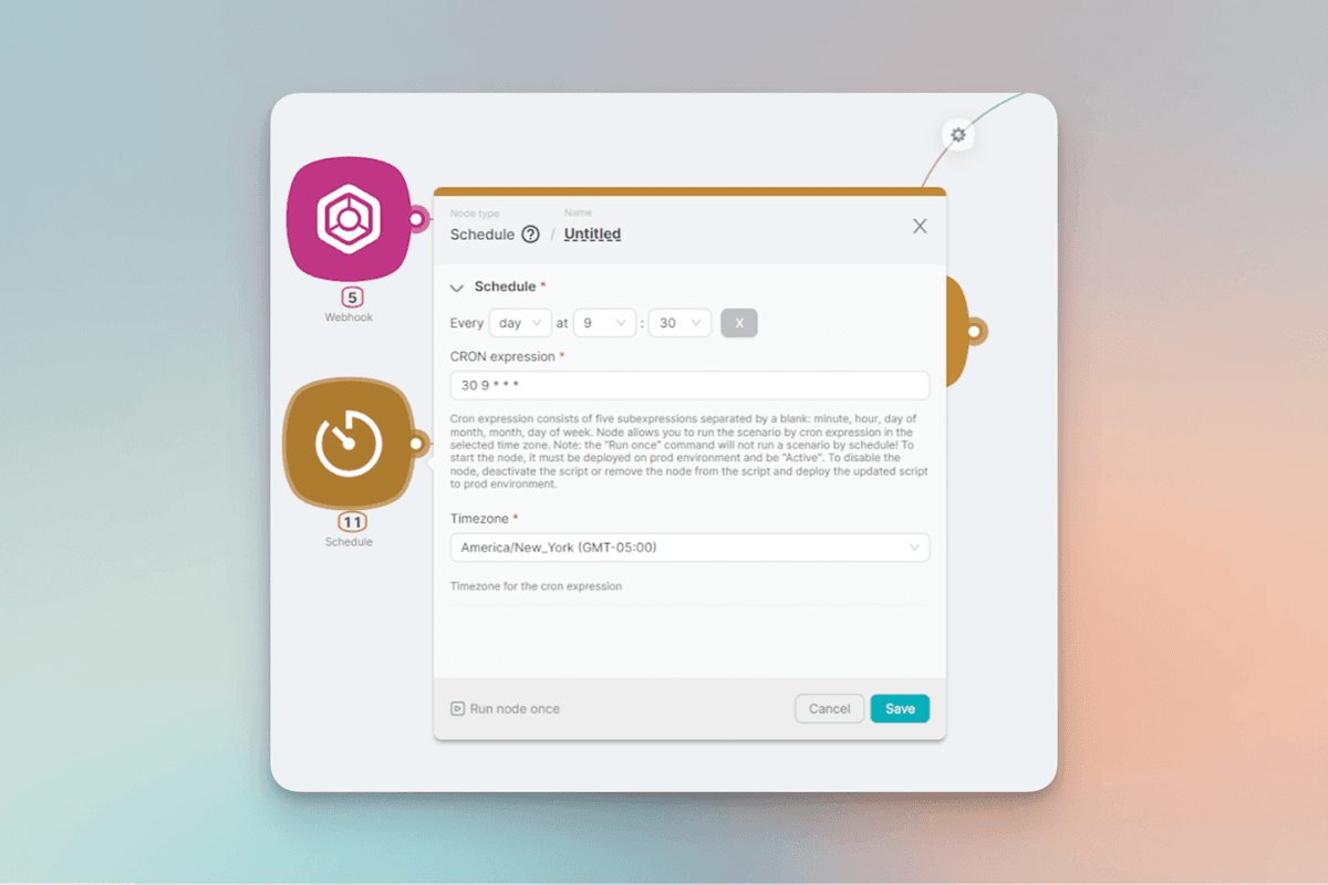 Schedule: Activates scenario once in a set period of time.