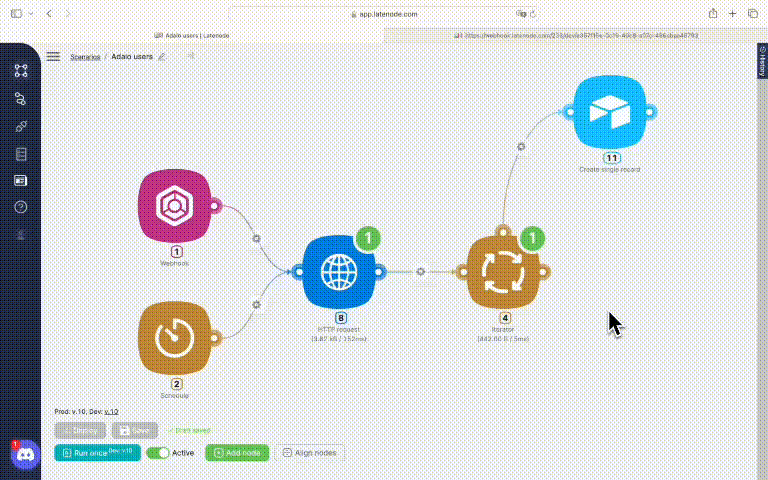 Our scenario is ready! Now save, deploy, use a webhook link to activate it, and here we are! We’ve added our user database from Adalo to Airtable. And, once again, you can use Notion or Google Sheets instead, the process is the same.