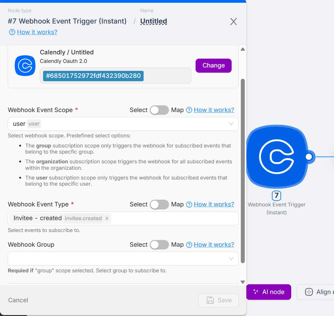 This node will act as a trigger, starting the automation every time a new meeting is created in Calendly. You can subscribe to additional events, such as Invitee - Cancelled, No Show, and others.
