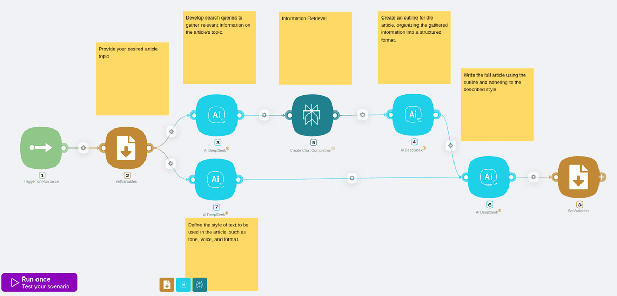 Now, it’s time to write an article outline. Latenode’s tool integrates DeepSeek AI to craft a clear, logical outline tailored to your topic.