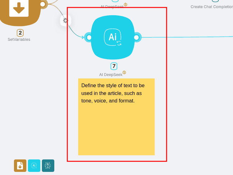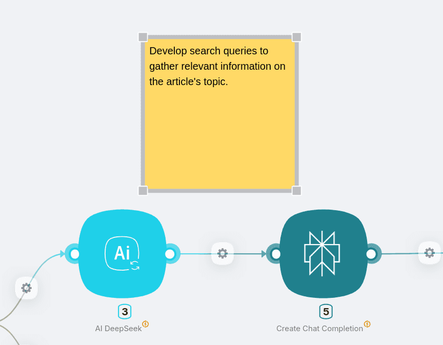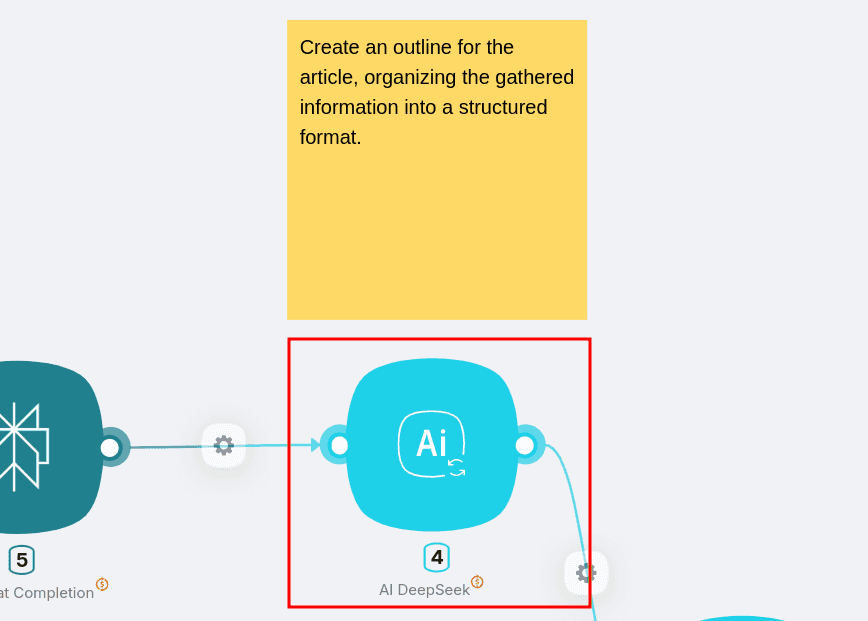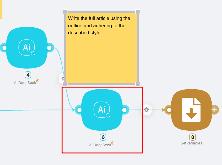 The final DeepSeek AI integration node transforms your outline into a complete, polished article by: