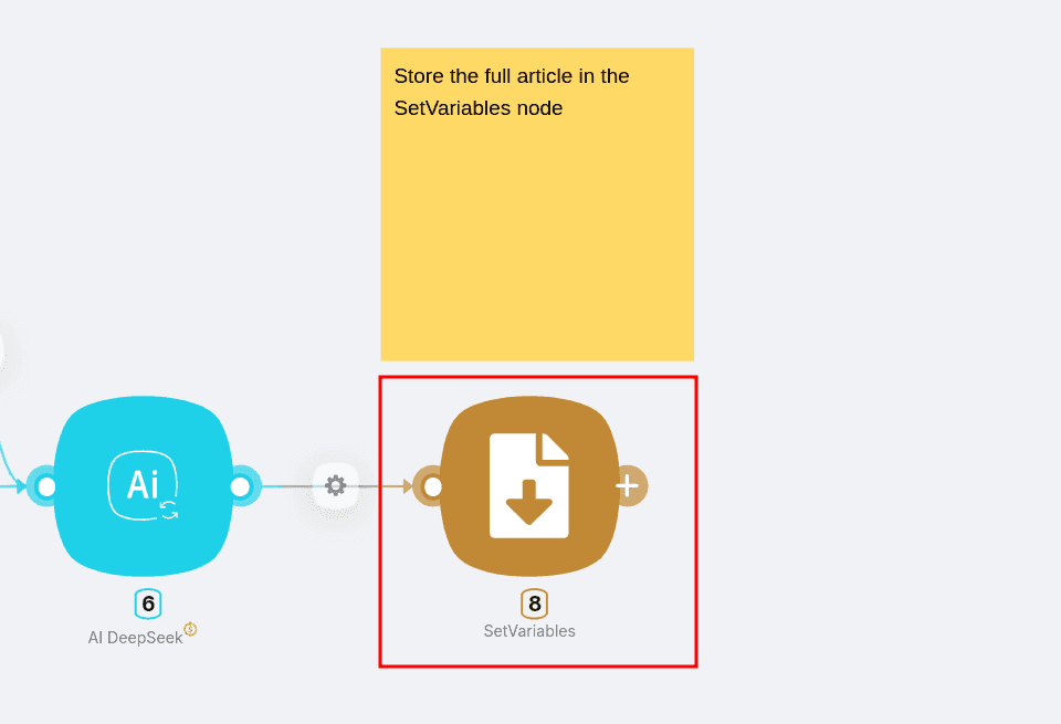 Latenode stores your finalized article using the SetVariables node, allowing seamless export to other integrations: