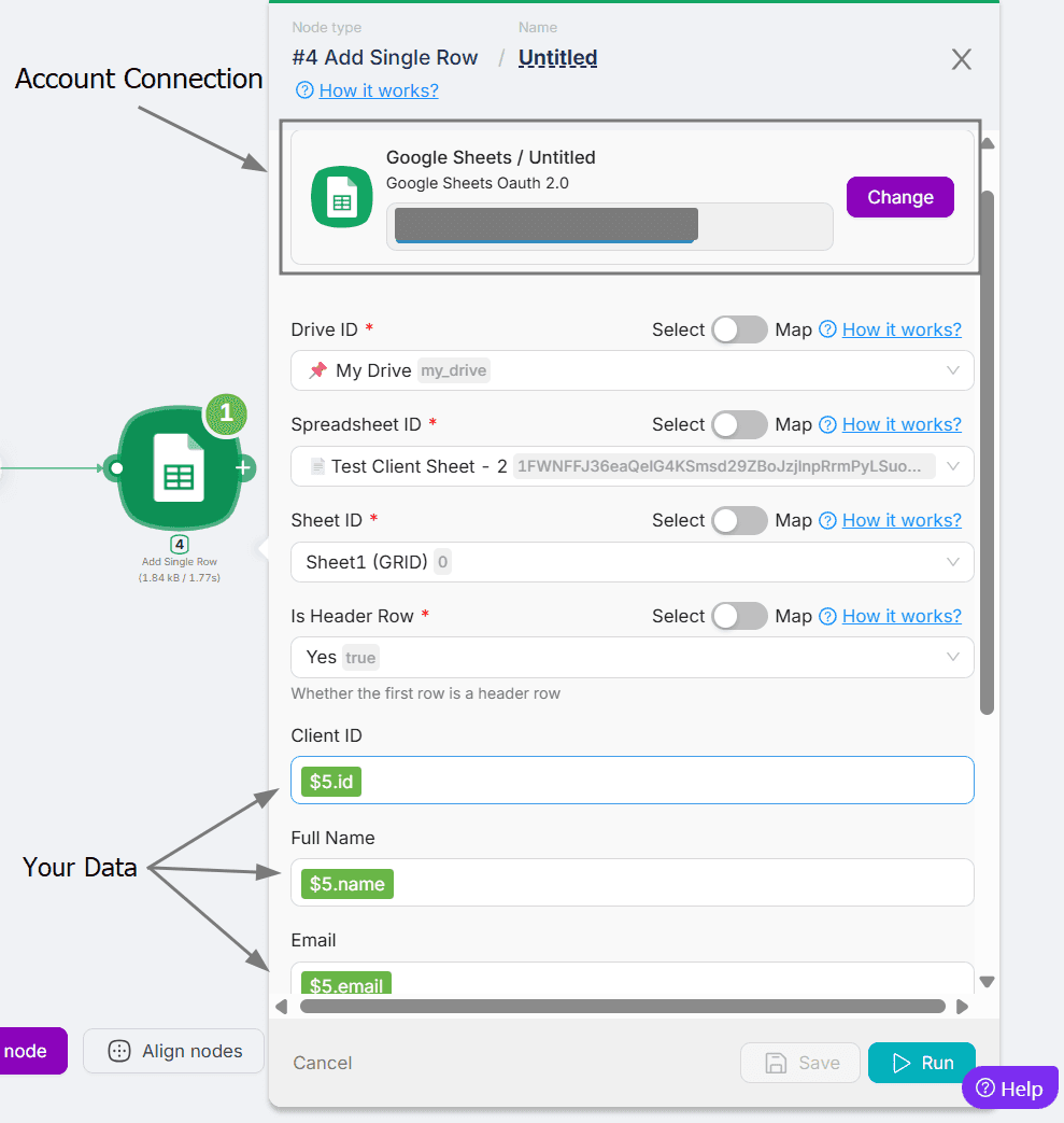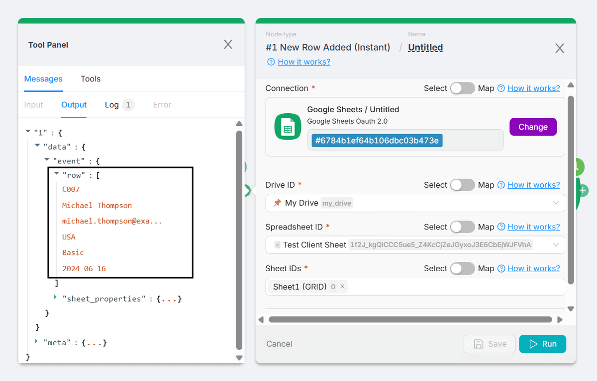 Let’s make sure it works! Click Run once in the lower corner, and add your data. Latenode will run your setup, and you should see a new row appear in your second sheet. If it’s there, congrats - it’s working! (Feel free to delete this test row if you want to keep things clean.)