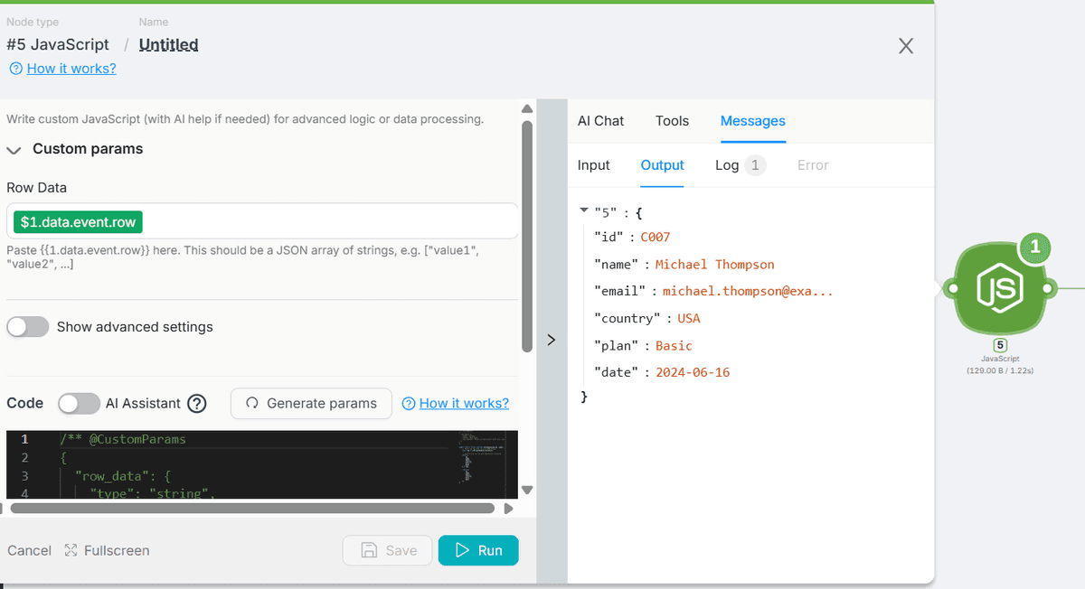 So, let’s create a simple function using an integration node with JavaScript code and a built-in AI assistant