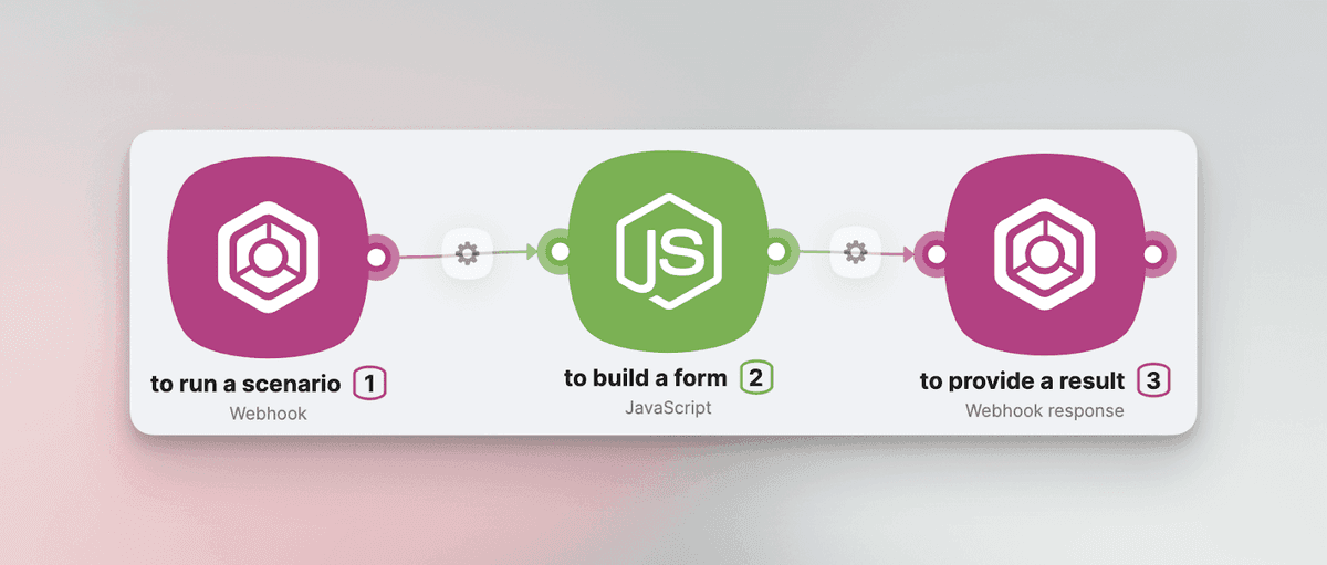 At the heart of it, the first block, Webhook, provides a unique Webhook URL to activate the scenario. Next, the JavaScript block reveals an HTML form aimed at collecting information. The last block, Webhook response, displays this form, making it accessible through the Webhook URL.
