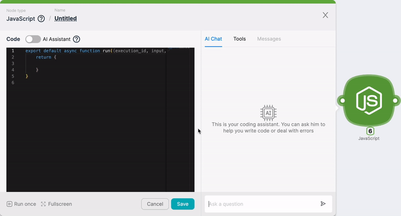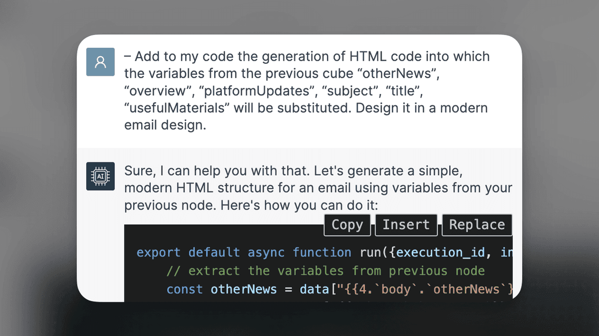 Now with these variables available on the platform, creating a custom email becomes possible. Next, we add a JavaScript block and ask the AI assistant with a new request: