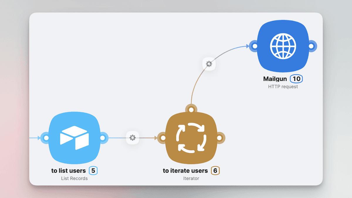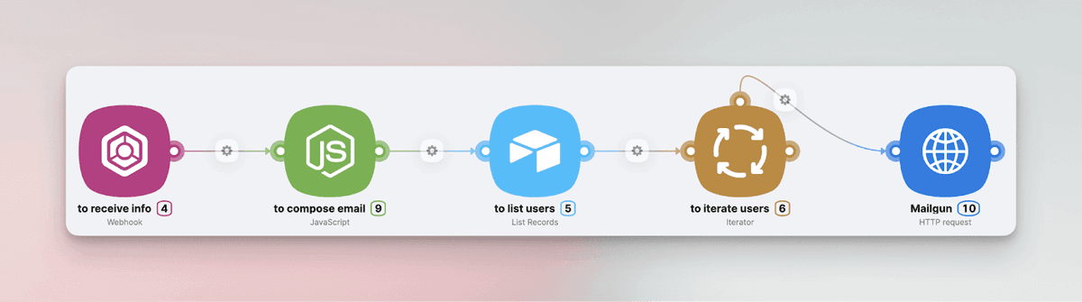 - Iterator + HTTP request: Sends the prepared email to each user through Mailgun
