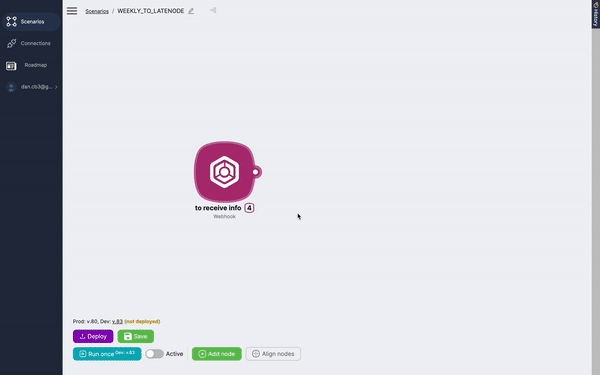 To craft a new email filled with content from the form, another Latenode scenario is needed. This area also handles the email sending function. Essentially, we're looking at two separate scenarios: content collection and its subsequent use. Here's the reasoning.