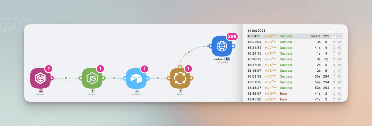 Below is a look at our service working on real data, where the HTTP request module ran 288 times, sending 288 emails