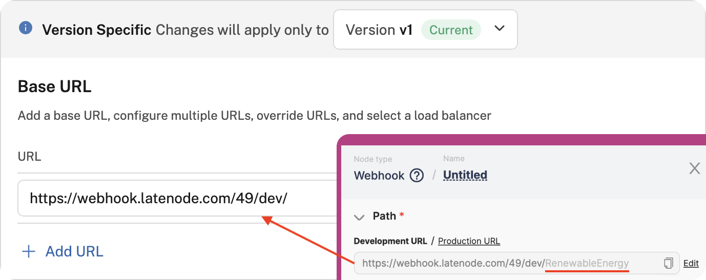 The main task is to set the endpoint's path using the base URL. For our example, this path matches the changeable part of the Webhook URL on the Latenode platform: