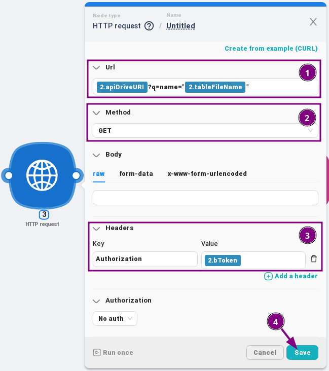 Create the "HTTP request" node to get the id of the table file: "+ Add node" => "Http" => "HTTP request";