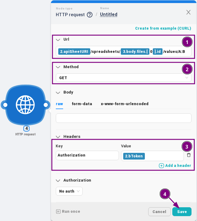 Let's form the "Url" field: at the beginning let's substitute the variable "apiSheetURI" from "JavaScript", after it /spreadsheets/, then let's substitute the value we got in the previous node {{ 3.body.files[ 0 ].id}}, and then /values/A:B;