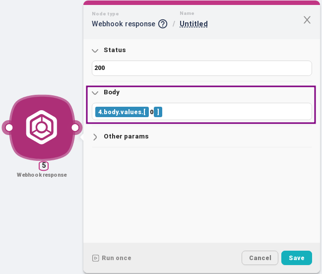 Let's create a "Webhook response" node to return found values: "+ Add node" => "Http" => "Webhook response";
