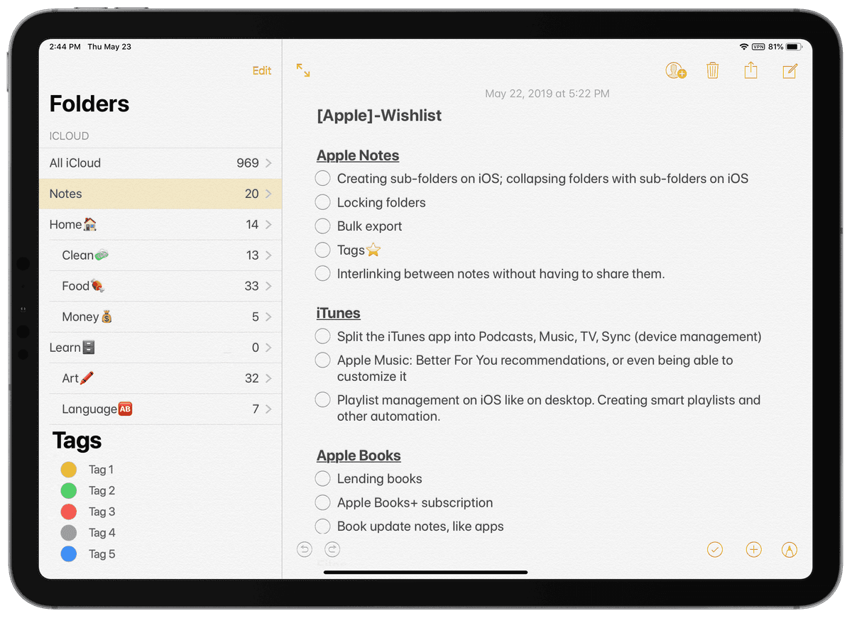 Apple Notes supports checklists for tracking task completion. This feature turns any note into an actionable checklist.