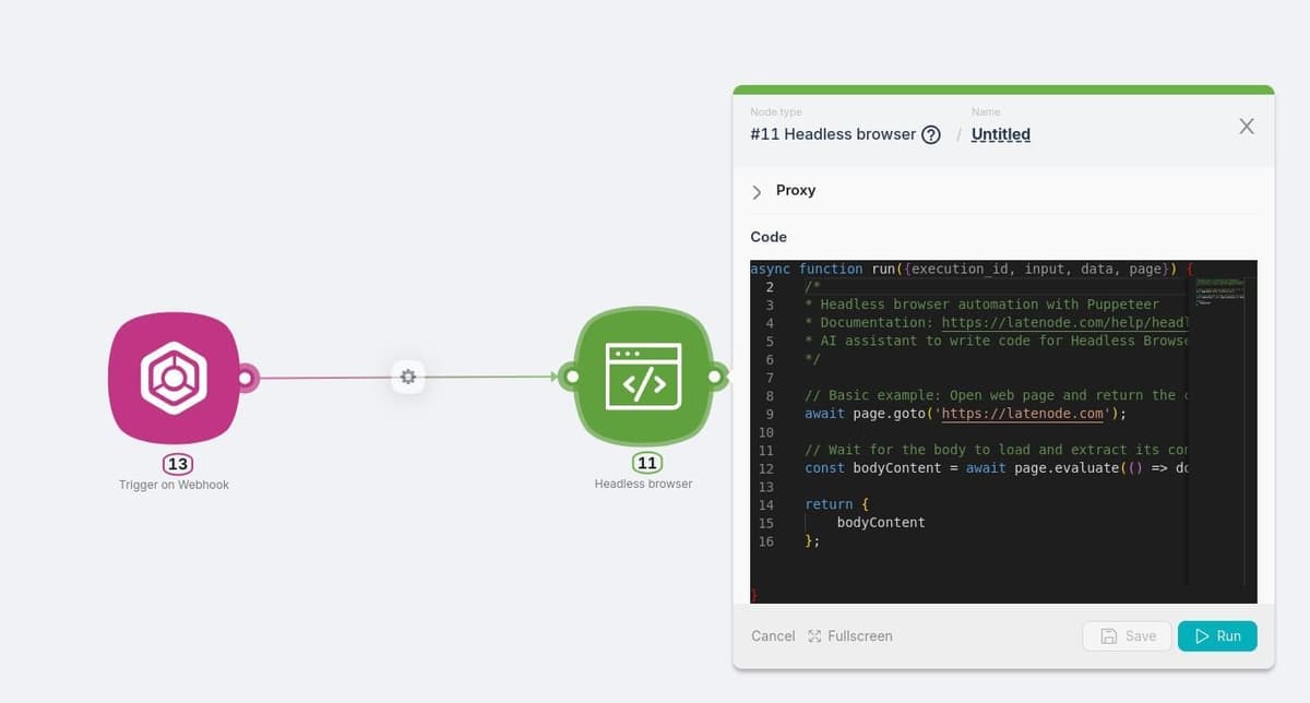 Use it to scrape all public information from websites, take screenshots of web pages, and fill out forms. Essentially, it's Puppeteer, just integrated as a node in Latenode. Search for it in the Code folder in Latenode's library. When you open it, you'll get access to the code editor and proxy settings.