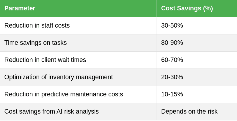 - AI-optimized inventory management enables a 20-30% reduction in storage costs and prevents excess stock. Predictive AI anticipates equipment failures and schedules maintenance, lowering downtime and repair expenses by 10-15%. Moreover, AI risk analysis helps companies minimize losses and sidestep costly legal issues, yielding savings proportional to the specific risk involved. (ARCA)
