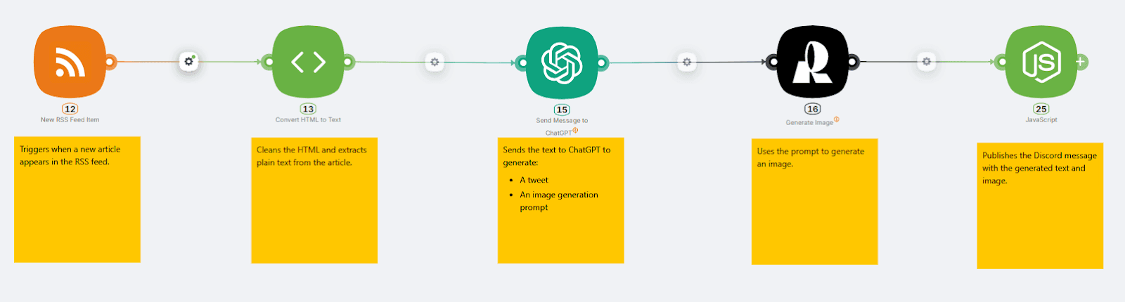 - That's it! Your automation will now watch for new articles, create Discord posts, generate images, and post to Discord automatically.