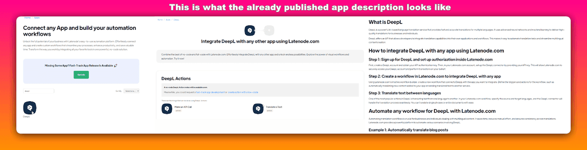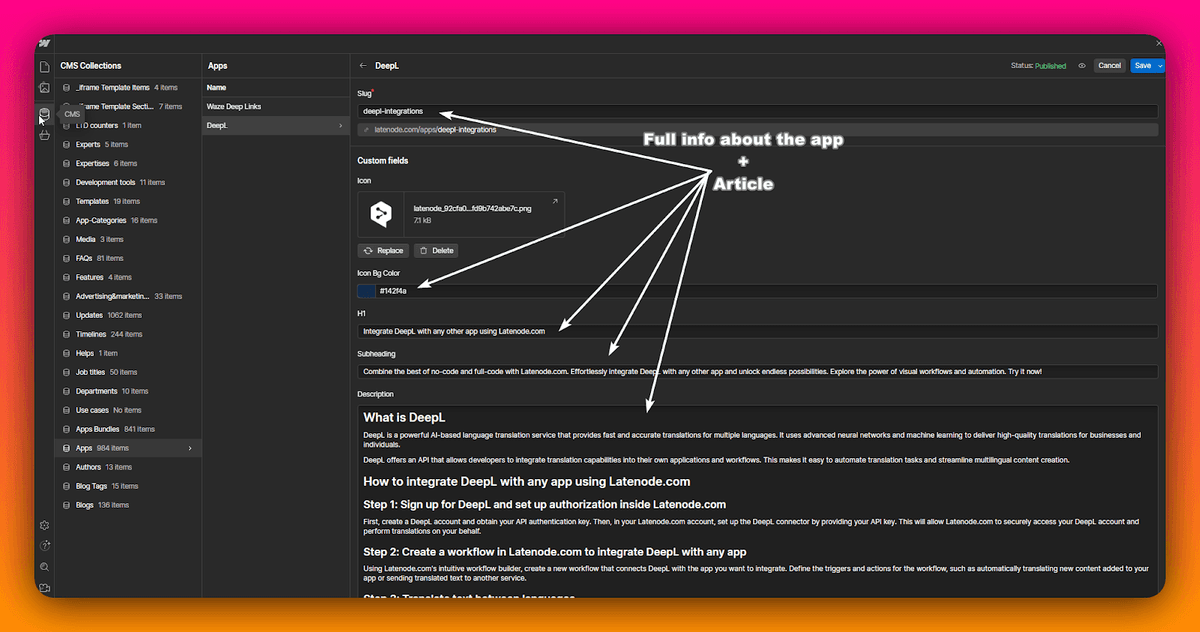 The process of automating seo involves automatically filling in the fields for each application, such as the article title, main text, meta tags, and other relevant information. After configuring these blocks and running the scenario, the new page with the application description goes live on our website.