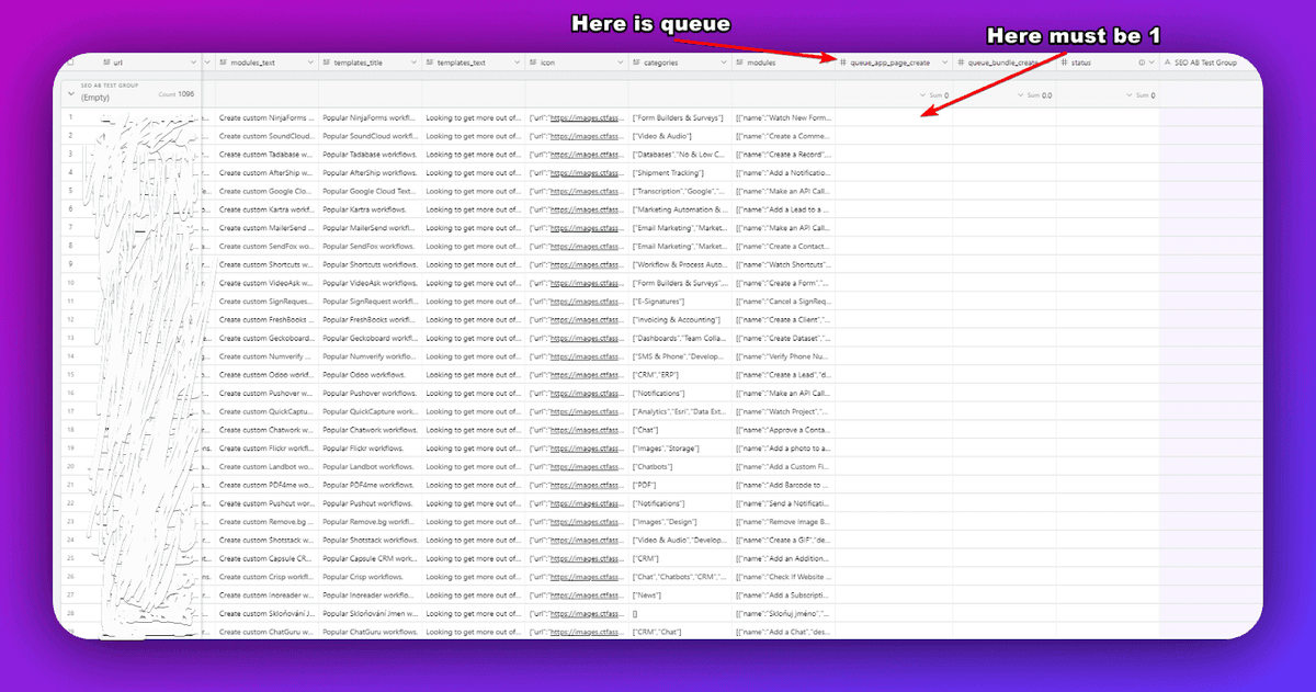 The key column is called "queue_app_page_create". Initially, this column is empty for all rows, but as soon as the value "1" is entered, the row is automatically moved to the "Queue" view. This indicates that the application is ready for processing and text generation. (You can use any application in which you are comfortable creating a list)