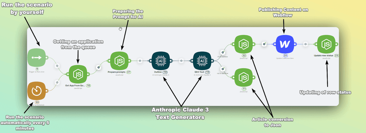 If you'd like to explore the entire scenario in detail, including the integration with Airtable for queue management and the publishing process on Webflow, please refer to our full guide here.