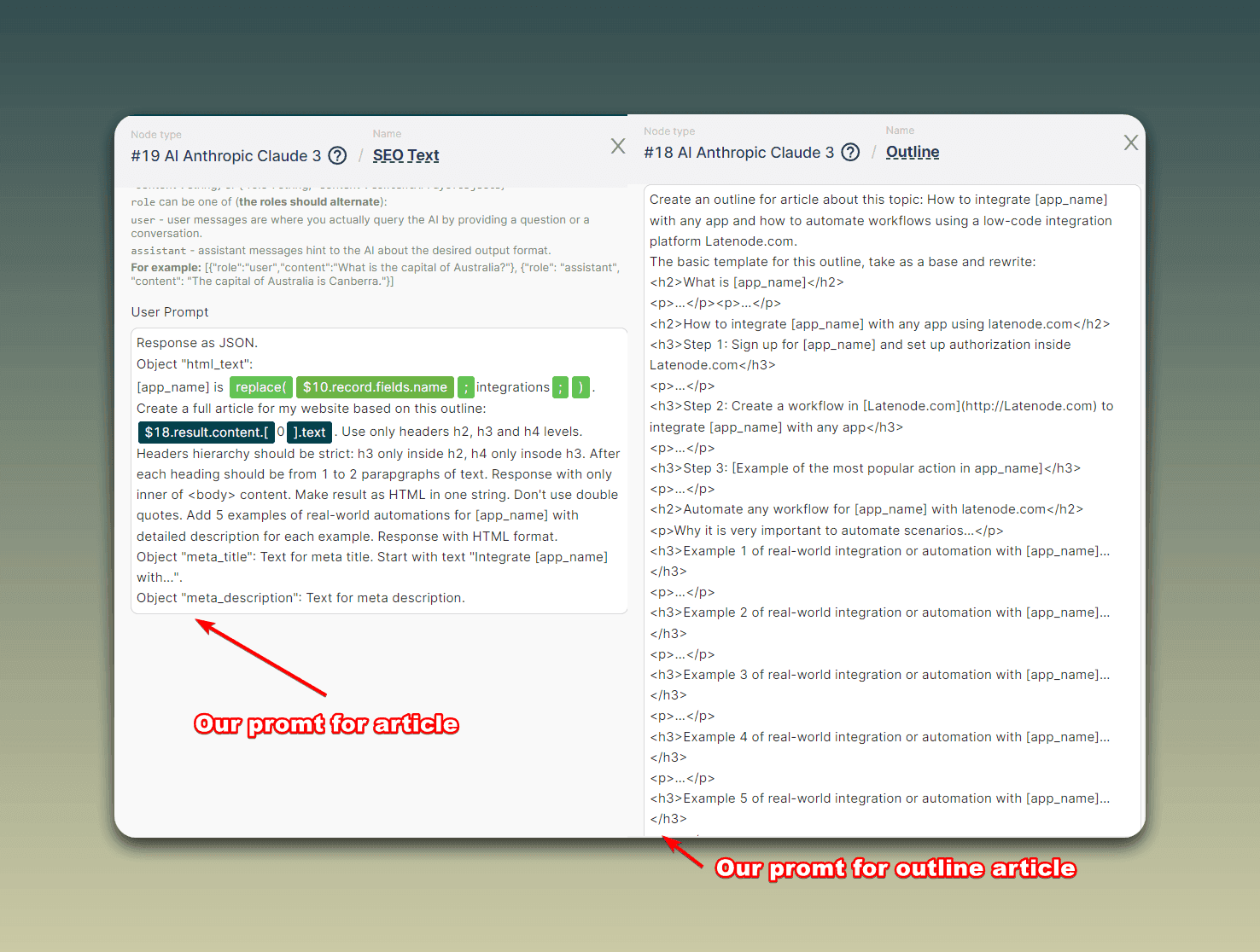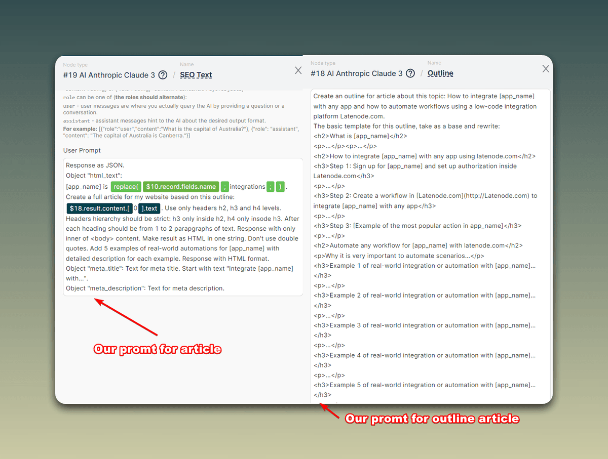First, the scenario sends a request to Claude 3 to create an outline (structure) for the future article about integrating the selected application with Latenode. Claude 3 generates this outline, which serves as the foundation for creating the full article text.
