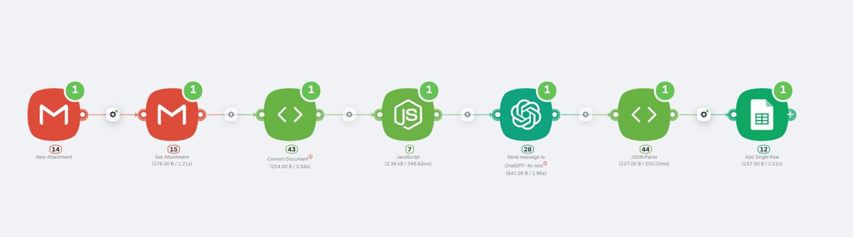 The structured response from ChatGPT is converted through the JSON Parse node, transforming it into an organized array structure. This formatted data is then perfectly aligned for seamless Google Sheets integration. The IsInvoice field parameter will help you get data from ChatGPT to filter results, ensuring only actual invoices (not brochures or catalogs, for example) are processed. Here is what it looks like: