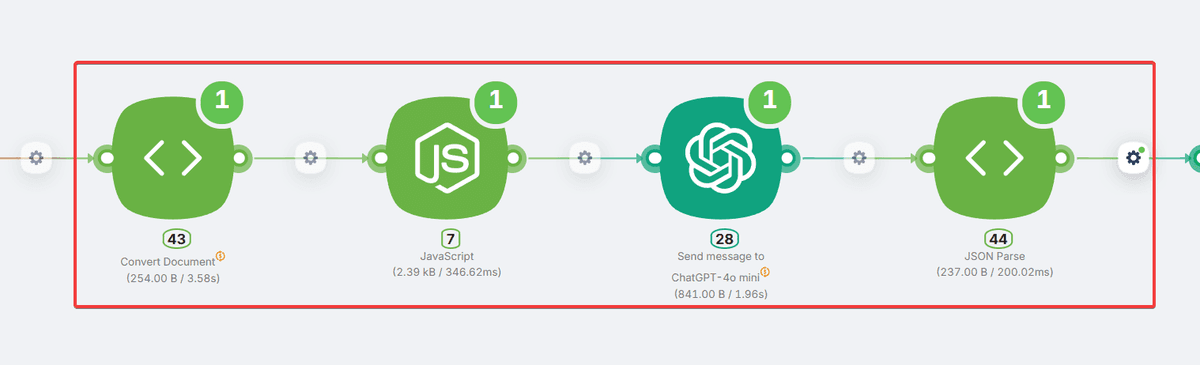 We need JavaScript to analyze and extract content from the document. This node prepares the data for subsequent processing steps via this script, completely generated by Latenode’s Javascript AI assistant: