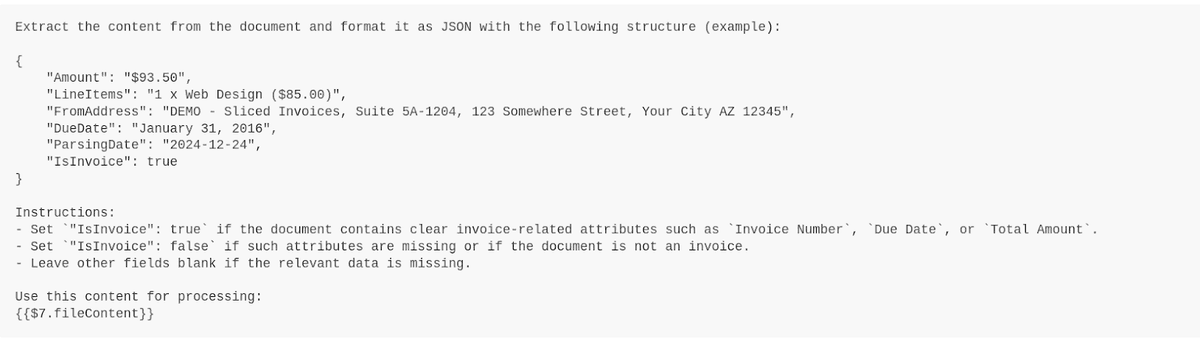 The extracted content goes through processing by ChatGPT 4o Mini. Using precisely crafted prompting, the system transforms unstructured invoice data into JSON format: